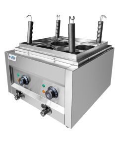 40629 (code) Βραστήρας ζυμαρικών με 2 δεξαμενές 4lt 166x345x185mm οι οποίες λειτουργούν χωριστά με θερμοστάτη 30-110°C. Η κάθε δεξαμενή διαθέτει 2 καλάθια φ135x140mm. Τα καλάθια διαθέτουν μακριά λαβή για εύκολο κράτημα. Ανοξείδωτη κατασκευή. 2x αντίσταση 1500W.  2x βρύση...