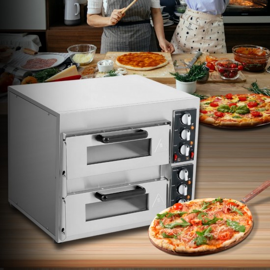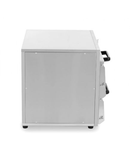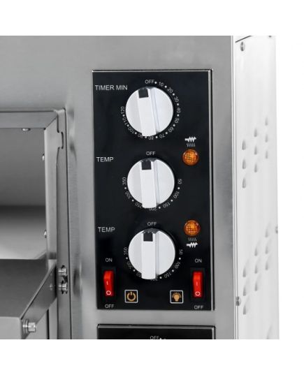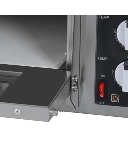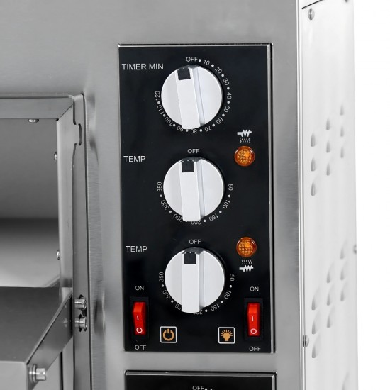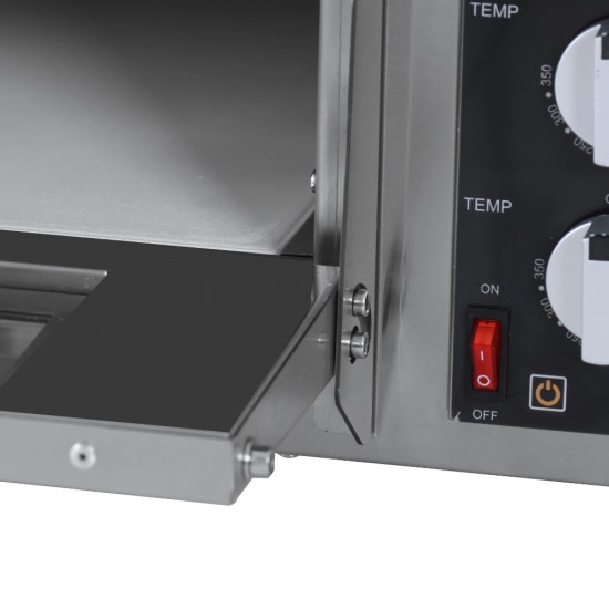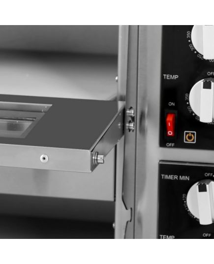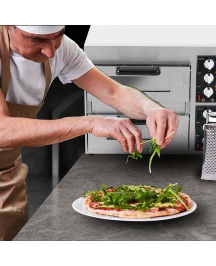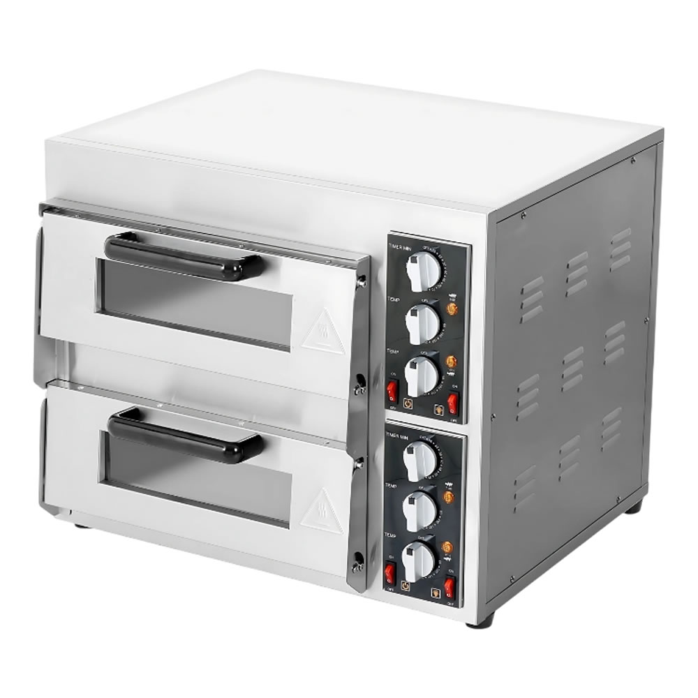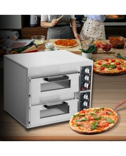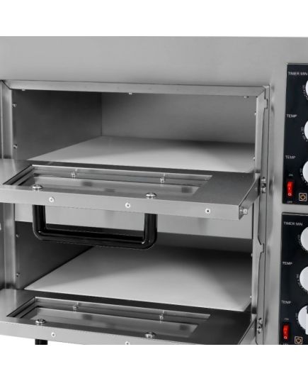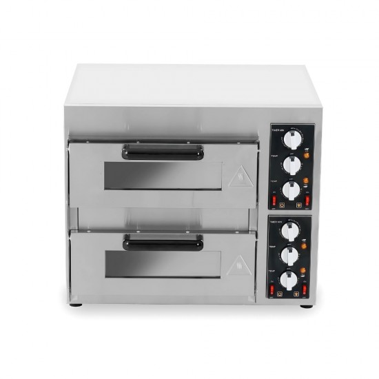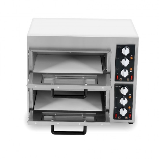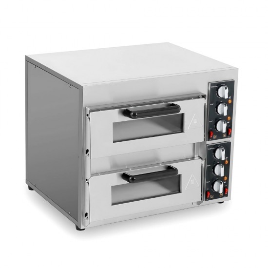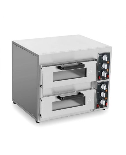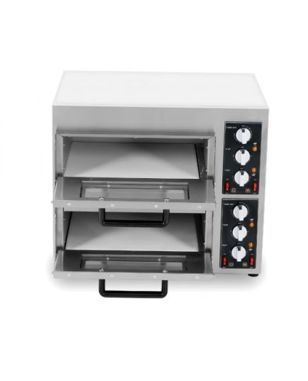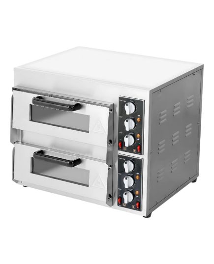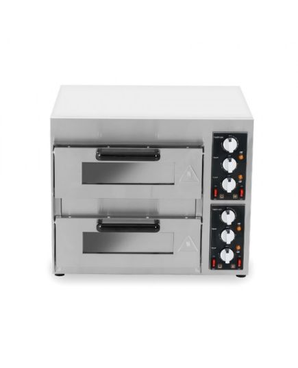 Επαγγελματικός φούρνος κατασκευασμένος από υψηλής ποιότητας ανοξείδωτο ατσάλι, κατάλληλο για τρόφιμα, ανθεκτικό και ασφαλές. Διπλός, με μεγάλη χωρητικότητα, είναι κατάλληλος για το ψήσιμο πίτσας και άλλων τροφίμων με βάση την ζύμη. Η θερμοκρασία ελέγχεται από δύο ανεξάρτητα κουμπιά. Με ξεχωριστή αντίσταση πάνω και κάτω στον κάθε θάλαμο, για μέγιστη θερμότητα και ισορροπημένο αποτέλεσμα ψησίματος. Έλεγχος της θερμοκρασίας της κάθε αντίστασης ξεχωριστά για κάθε θάλαμο (2 πάνω, 2 κάτω) και 2 ξεχωριστά timer. Η πίτσα ψήνεται γρήγορα, δεν απαιτείται προθέρμανση. Διαθέτει εσωτερικό φωτισμό με ξεχωριστούς διακόπτες και ορατό γυάλινο παράθυρο υψηλής αντοχής. Ιδανικός φούρνος για την παρασκευή πίτσας, σάντουιτς, πρέτσελ, κρουασάν και μιας μεγάλης ποικιλίας τροφίμων όπως πατάτες, ψωμιά, πίτες και αρτοσκευάσματα.