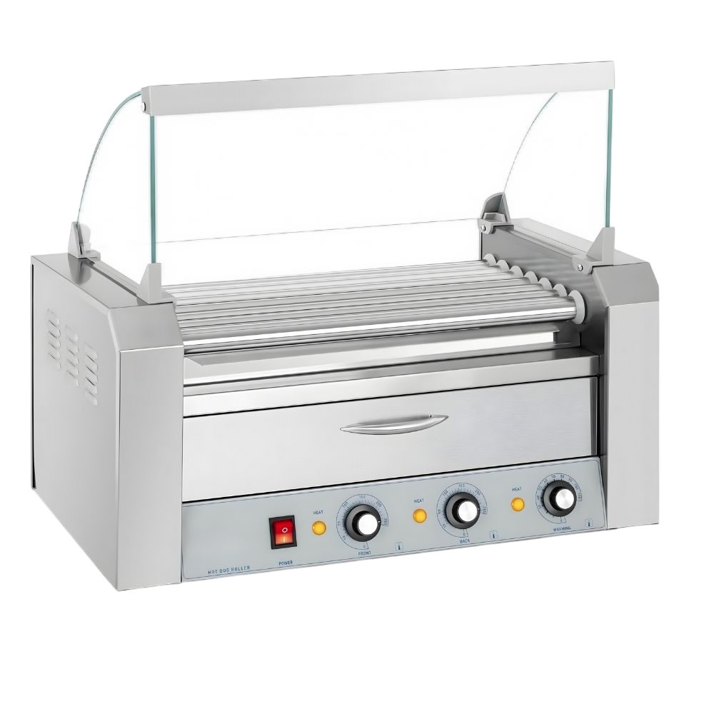 Επαγγελματική ψηστιέρα για Hot Dog, κατασκευασμένη εξ' ολοκλήρου από υψηλής ποιότητας ανοξείδωτο ατσάλι, για μέγιστη αντοχή στη συνεχή χρήση αλλά και απόλυτη υγιεινή στο καθάρισμα. Διαθέτει δύο ανεξάρτητες ζώνες θέρμανσης, επιτρέποντας το ψήσιμο με διαφορετικές ποσότητες ή για να διατηρεί ζεστά τα έτοιμα λουκάνικα χωρίς να παραψήνονται. Με διακόπτη On-Off και ακριβή θερμοστάτη, επιτρέπει την ακριβή ρύθμιση της θερμοκρασίας. Επιπλέον, το γυάλινο κάλυμμα προστατεύει τα προϊόντα από εξωτερικούς παράγοντες, αλλά και προσφέρει άψογη εμφάνιση, επιτρέποντας στους πελάτες να βλέπουν το ψήσιμο σε πραγματικό χρόνο. Είναι μια αξιόπιστη λύση για καντίνες, σνακ μπαρ και take-away που θέλουν να συνδυάζουν ταχύτητα, ποιότητα και επαγγελματικό design.