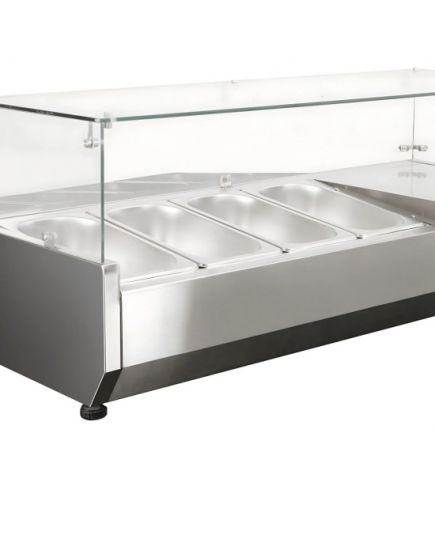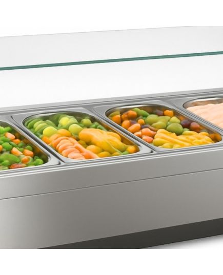 Ψυχόμενη επιτραπέζια βιτρίνα χωρητικότητας 42Lt, με 4 θέσεις και φωτισμό LED. Βάση κατασκευασμένη από ανοξείδωτο ατσάλι, με ψυκτικό υγρό R290 και λεκανάκια G/N 1/4. Ψηφιακός ρυθμιστής θερμοκρασίας, σύστημα βεβιασμένης ψύξης και εύρος θερμοκρασίας 2~12℃. Τα λεκανάκια GN περιλαμβάνονται, 4x1/4GN.