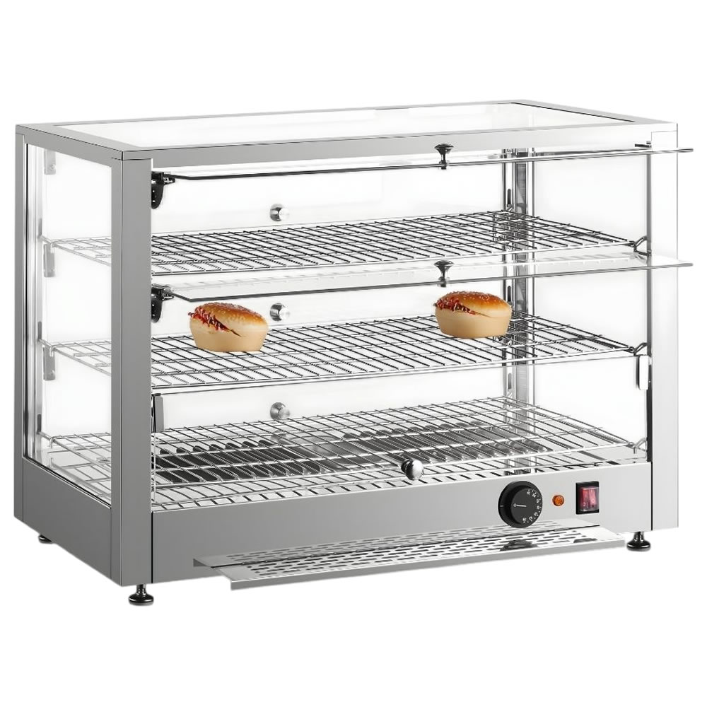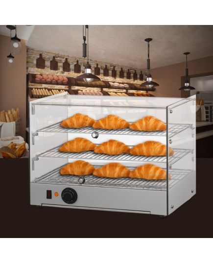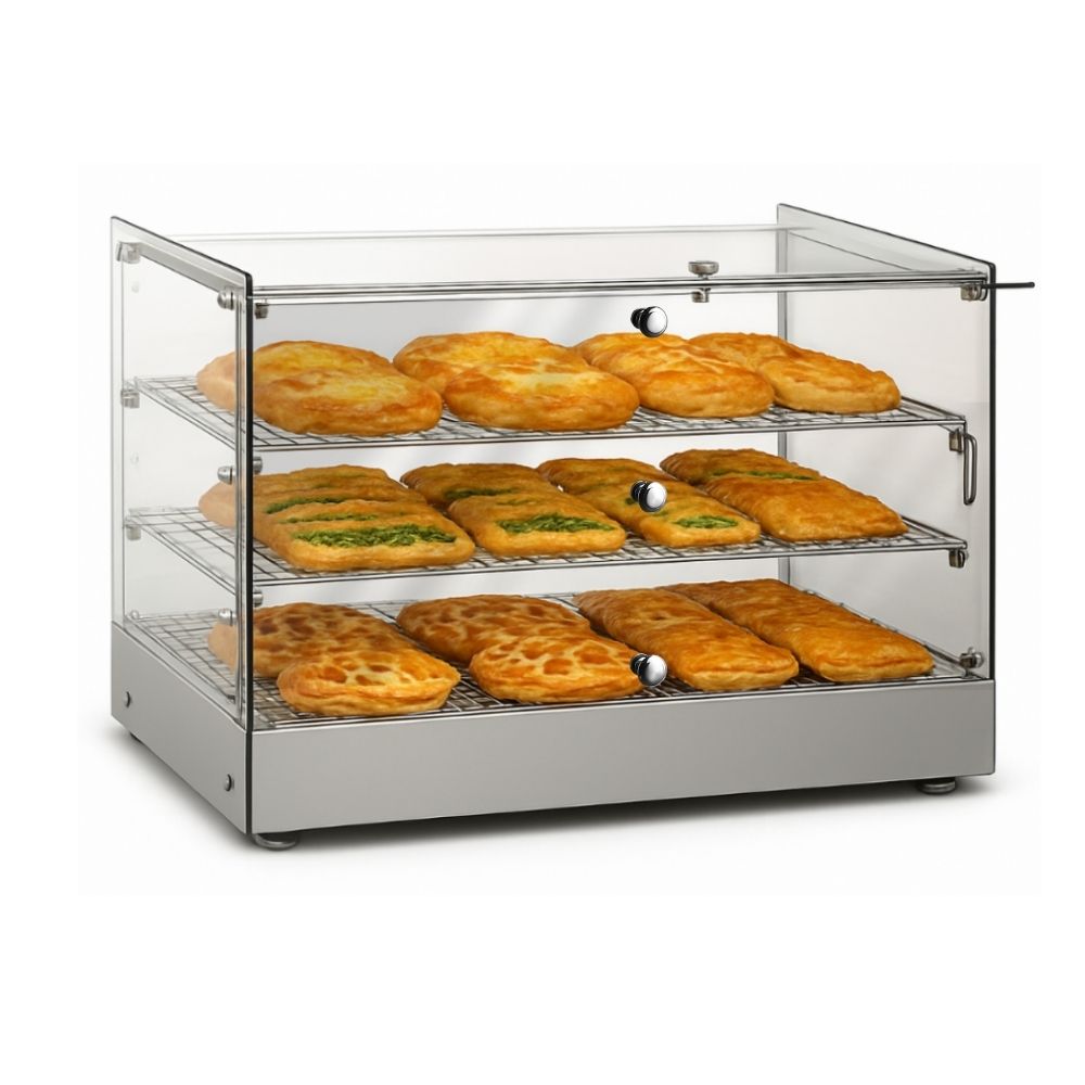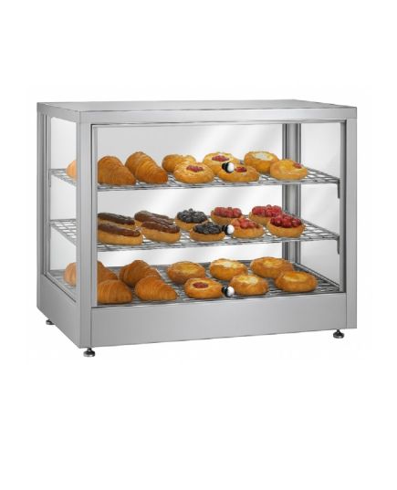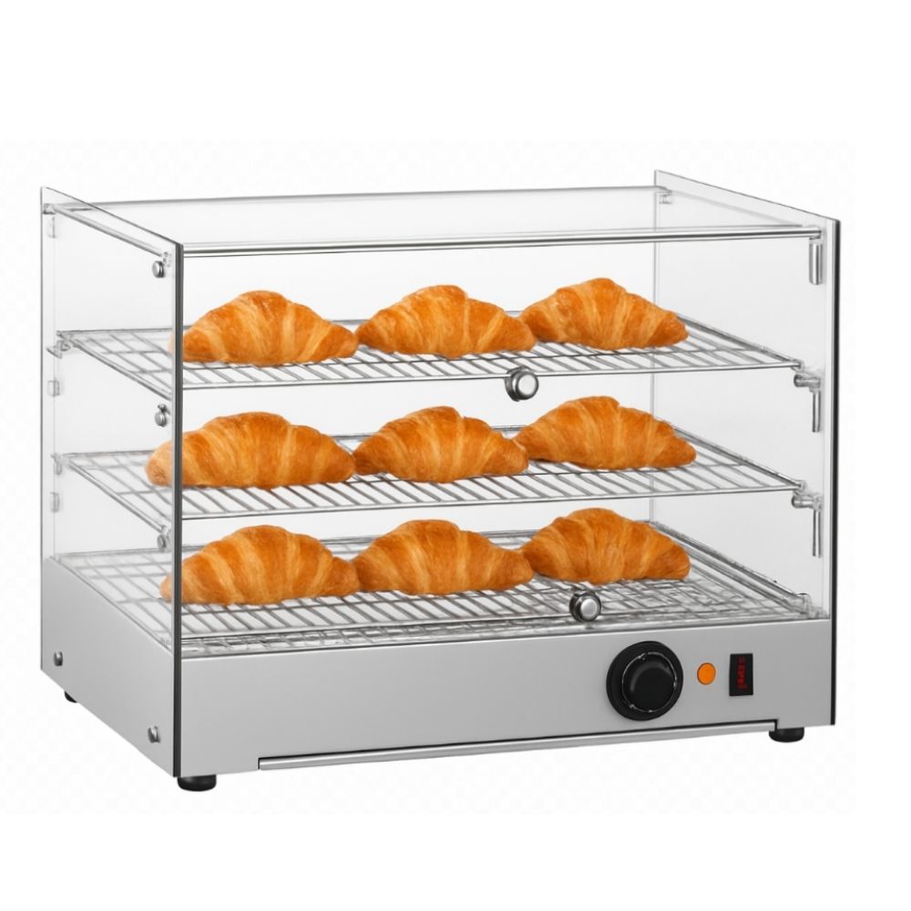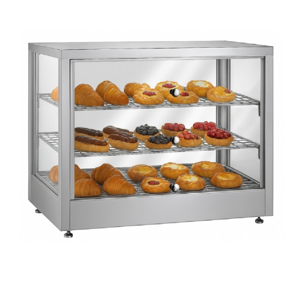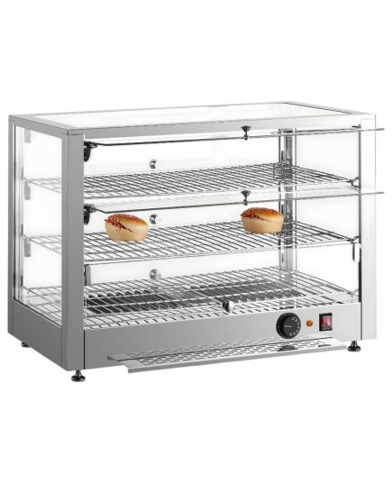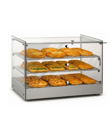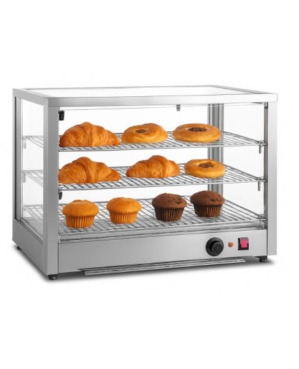 Θερμαινόμενη επιτραπέζια βιτρίνα που έχει σχεδιαστεί για να διατηρεί αρτοσκευάσματα, πίτσες και άλλα ζεστά σνακ στην ιδανική θερμοκρασία σερβιρίσματος. Διαθέτει ανθεκτικό περίβλημα από ανοξείδωτο ατσάλι για αντοχή και εύκολο καθαρισμό, προσφέροντας παράλληλα μέγιστη ορατότητα των τροφίμων. Διαθέτει ρυθμιζόμενο θερμοστάτη ακριβείας για την ρύθμιση του κατάλληλου επιπέδου θερμότητας. Στο εσωτερικό, τα σταθερά επιχρωμιωμένα ράφια παρέχουν στιβαρή στήριξη και ελκυστική παρουσίαση. Ιδανική λύση για αρτοποιεία και κυλικεία, συνδυάζει τη στιβαρή κατασκευή με τη λειτουργικότητα για την υγιεινή και αποτελεσματική προβολή των τροφίμων.