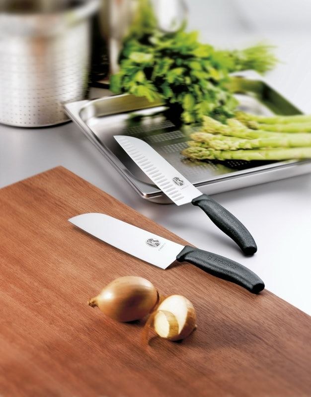 Το μαχαίρι Santoku της Ελβετικής εταιρίας Victorinox , είναι το μαχαίρι γενικής χρήσης που στα γιαπωνέζικα σημαίνει "τρεις αρετές", αφού μπορεί να χρησιμοποιηθεί για κρέας, ψάρι, και λαχανικά. Η μύτη του είναι πιο γαμψή από το μαχαίρι σεφ, ενώ το μήκος της λάμας του είναι ιδανικό για το ψιλοκόψιμο ακόμα και στον πάγκο της οικιακής κουζίνας, όπου ο χώρος είναι συνήθως πιο περιορισμένος. Το ελαφρύ του βάρος το κάνει άνετο και ξεκούραστο ακόμα και μετά από πολύωρη χρήση. Πρόκειται για ελαφριά μαχαίρια, κατάλληλα για πλύσιμο στο πλυντήριο πιάτων, 100% ελβετικά και με πολύχρωμες λαβές. Μια συλλογή όπου η λειτουργικότητα συνδυάζεται με τη διασκέδαση & επίσης περιέχει μερικά από τα πιο χρήσιμα μπλοκ μαχαιριών και σετ δώρου. Δεν υπάρχει τίποτα που δεν καλύπτει αυτή η μοναδική σειρά μαχαιριών!Τα προϊόντα Victorinox είναι πρακτικά, έχουν διάρκεια και λειτουργική αισθητική.