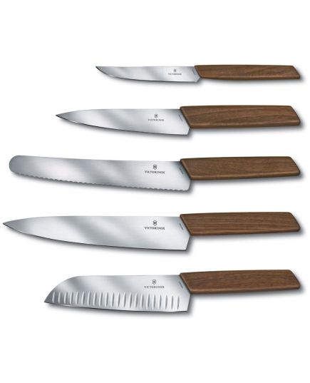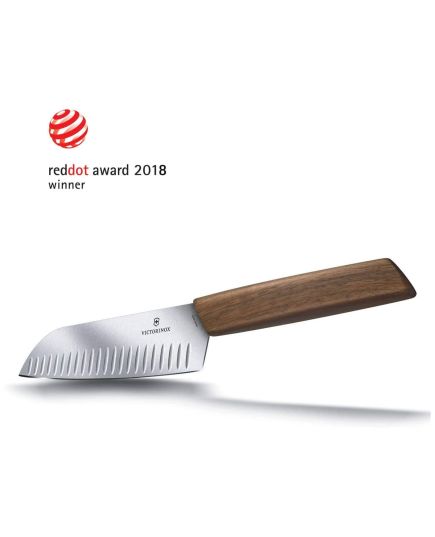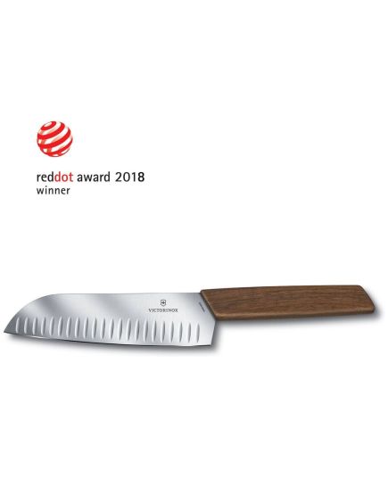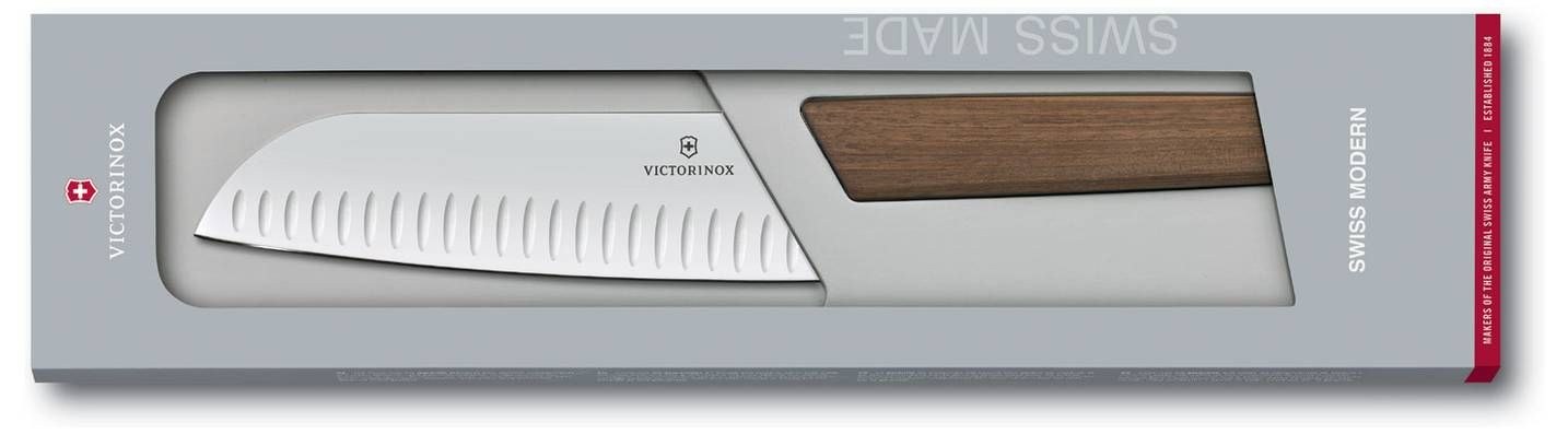 Το μαχαίρι Santoku της Ελβετικής εταιρίας Victorinox , είναι το μαχαίρι γενικής χρήσης που στα γιαπωνέζικα σημαίνει "τρεις αρετές", αφού μπορεί να χρησιμοποιηθεί για κρέας, ψάρι, και λαχανικά. Η μύτη του είναι πιο γαμψή από το μαχαίρι σεφ, ενώ το μήκος της λάμας του είναι ιδανικό για το ψιλοκόψιμο ακόμα και στον πάγκο της οικιακής κουζίνας, όπου ο χώρος είναι συνήθως πιο περιορισμένος. Το ελαφρύ του βάρος το κάνει άνετο και ξεκούραστο ακόμα και μετά από πολύωρη χρήση. Η σειρά Swiss Modern της Victorinox αποτελεί τον συνδυασμό του στυλ & της αποστελεσματικότητας. Κάθε μαχαίρι της σειράς αποτελείται από ανθεκτικό στη φθορά ανοξείδωτο ατσάλι και συνδυάζεται με μια πλούσια σε ίνες, μοναδική λαβή από ξύλο ευρωπαϊκής καρυδιάς. Εργονομικά σχεδιασμένο για απόλυτη άνεση και ταυτόχρονα ελαφρύ στο χέρι αυτό το μαχαίρι αποτελεί ό,τι πιο σύγχρονο έχει να παρουσιάσει η Victorinox στα εργαλεία κουζίνας.