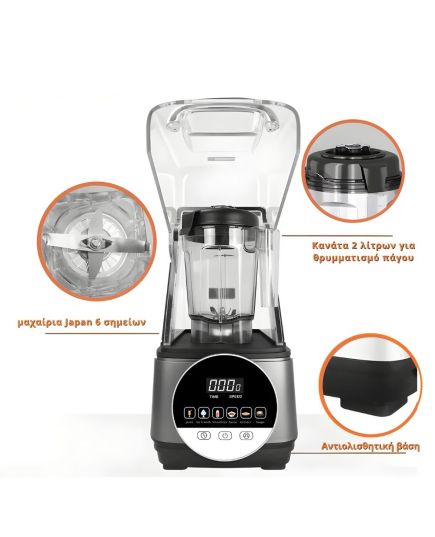 Επαγγελματικό μπλέντερ της επιτυχημένης σειράς TIGER με θωράκιση για αθόρυβη λειτουργία και εξαιρετική απόδοση. Μπορεί να χρησιμοποιηθεί ως παγωτομηχανή, μηχανή milkshake, μηχανή smoothie και παγοθραύστης. Ως μπλέντερ, μπορεί να αναμειγνύει διάφορα λαχανικά, φρούτα, ξηρούς καρπούς και δημητριακά, να εξάγει γρήγορα βιταμίνες από αυτά τα συστατικά και να τα ομογενοποιεί. Δυνατότητα επιλογής 7 διαφορετικών προγραμμάτων. Ισχυρός κινητήρας βαρέως τύπου, αεριζόμενος. Με διάφανη πολυκαρβονική κανάτα 2lt BPA-Free με δοσομετρητή σε ml/oz/φλυτζάνια. Επιλογή manual για αυξομείωση ταχύτητας ή χρόνου μέσω Touch Panel. Αθόρυβη 72DB λειτουργία και ισχυρός κινητήρας βαρέως τύπου, αεριζόμενος. Ανοξείδωτο κόμπλερ και μαχαίρια Japan 6 σημείων. Με Touch Power και εύκολο στην χρήση και στον καθαρισμό του. Με Touch Pulse για καθαρισμό του μπλέντερ. Περιλαμβάνει τάμπερ για βελτιωμένη ανάδευση και επεξεργασία.