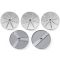 - Περιλαμβάνονται 5 δίσκοι κοπής: Φέτες 2mm (δίσκος με 3 λεπίδες), φέτες 4mm (δίσκος με 3 λεπίδες), τρίφτης 3mm, τρίφτης 5mm, τρίφτης 7mm Δίσκος εκκένωσης.