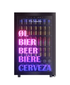 Επαγγελματικό ψυγείο μπύρας 128L με εύρος θερμοκρασίας -6°C έως +18°C, RGB LED φωτισμό με τηλεχειριστήριο, χαμηλό θόρυβο 39dB και χωρητικότητα έως 153 κουτάκια.