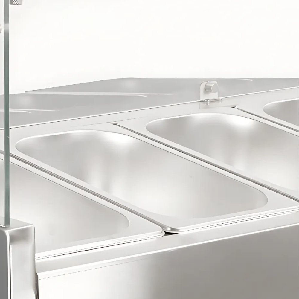 Ψυχόμενη επιτραπέζια βιτρίνα χωρητικότητας 62Lt, με 6 θέσεις και φωτισμό LED. Βάση κατασκευασμένη από ανοξείδωτο ατσάλι, με ψυκτικό υγρό R290 και λεκανάκια G/N 1/4. Ψηφιακός ρυθμιστής θερμοκρασίας, σύστημα βεβιασμένης ψύξης και εύρος θερμοκρασίας 2~12℃. Τα λεκανάκια GN περιλαμβάνονται 6x1/4GN.