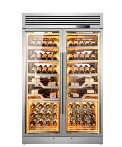 Premium συντηρητής κρασιών 144 φιαλών με 2 ζώνες 5–20°C, UV προστασία, inverter ψύξη, συρόμενα ράφια ξύλου/inox και συμβατότητα Vinotag®. Κατάλληλος για οικιακή και επαγγελματική χρήση.