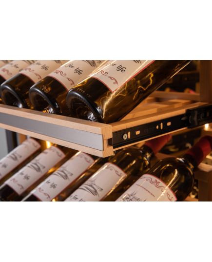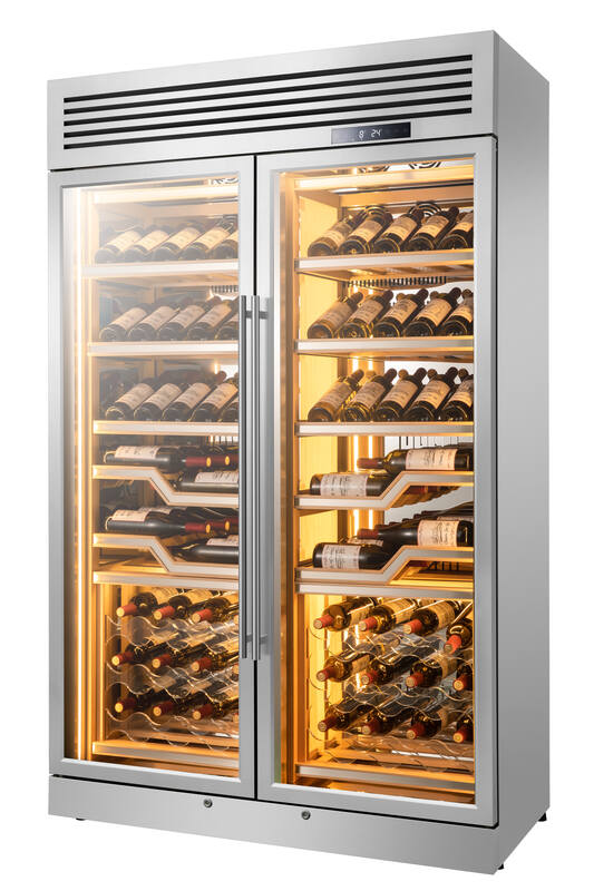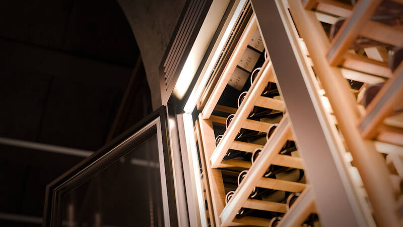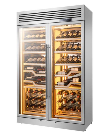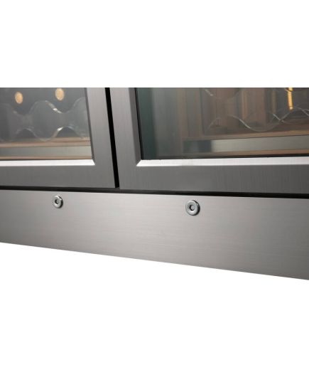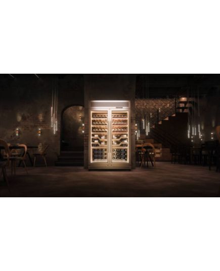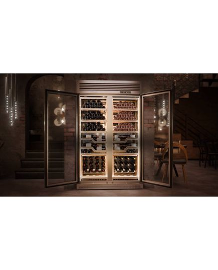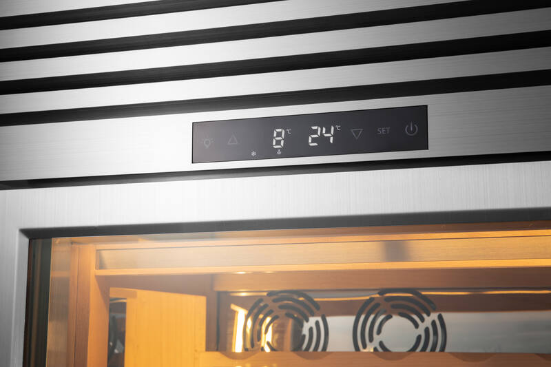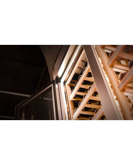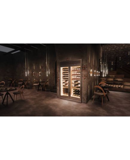 Ο λευκός LED φωτισμός προσφέρει διακριτική και ομοιόμορφη προβολή των ετικετών, ενώ η πόρτα με ανοξείδωτο πλαίσιο προσθέτει premium αισθητική. Η επιλογή μόνιμου φωτισμού επιτρέπει εντυπωσιακή παρουσίαση σε κάβες & wine bars.