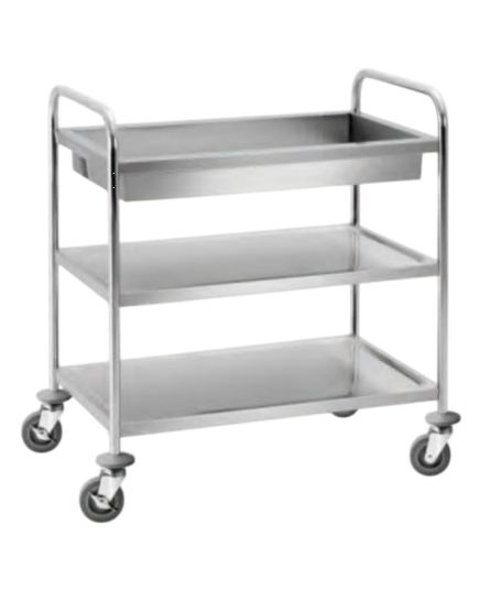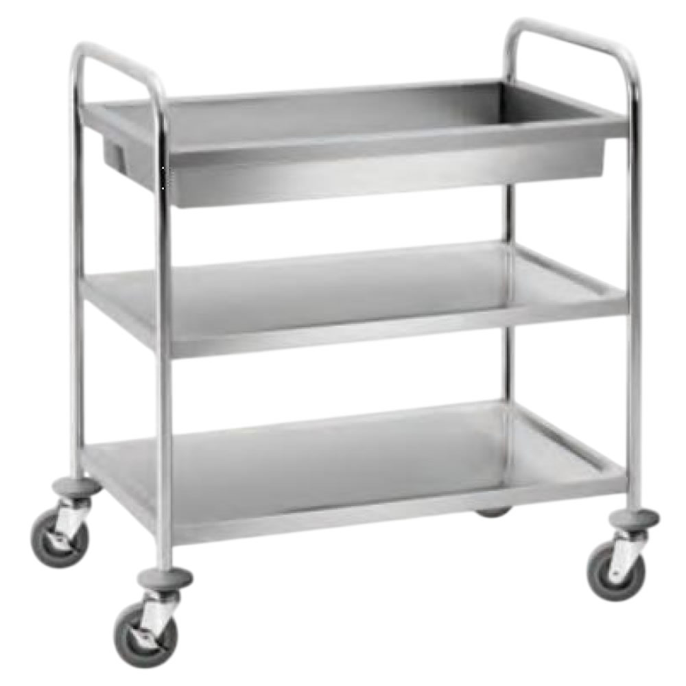 Ανθεκτικό καρότσι από ανοξείδωτο χάλυβα 3 ραφιών με το πάνω ράφι βαθύ 10 εκ. που κυρίως χρησιμοποιείται για μάζεμα μαχαιροπίρουνων. Επιπλέον για διανομή ή περισυλλογή πιάτων, δίσκων, ποτηριών κ.α. σε εστιατόρια, για πρωινά σε ξενοδοχεία ή για μεταφορά σε χώρους πλύσης.